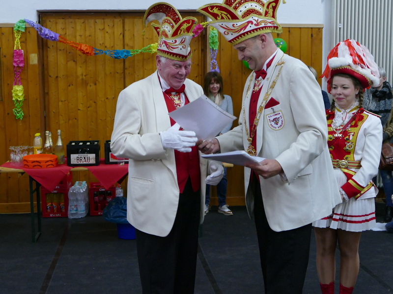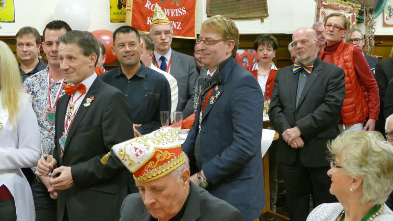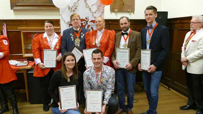 Im Anschluss wurden die langjährigen Förderer und Freunde der Funken, Waldemar Rossol und Patrick Kaufmann (beide „Rhein Mosel Gastronomiebetriebe KG“) sowie Dirk Strubel (Globus, KO-Bubenheim) durch Verleihung des Ehrenordens und einer Urkunde zu Ehrenfunken ernannt. Den Verdienstorden des Vereins für mehrjährigen besonderen Einsatz für die K.K. Funken „Rot-Weiß“ erhielten die Mitglieder Anja Emeka, Angelina Haas, Keven Langenbach und Tina Ludwig.